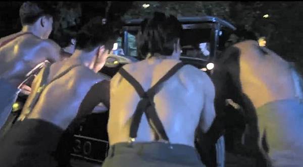 壞人追來被一群大力士擋著,決定開車子撞。